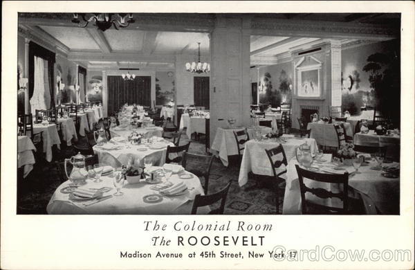 The Roosevelt (A Hilton Hotel) - Madison Avenue at 45th Street, is but a brief step from New York's most famous stores, theatres and night clubs, and is connected directly by private passageway with Grand Central Terminal. The Colonial Room is the main dining room of the Roosevelt Hotel, a friendly informal room decorated in Colonial style. Frank G. Wangeman, general manager |