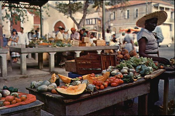 y Rahola Photo Supply, Santurce, Puerto Rico MARKET-PLACE SCENE IN BEAUTIFUL ST THOMAS, VIRGIN J. S. A. Kodachrome by Louis Dormand Dormand Postcard, Riverhead, Long Island, N. Y. DS28328A 3¢ 4¢ AP HERE