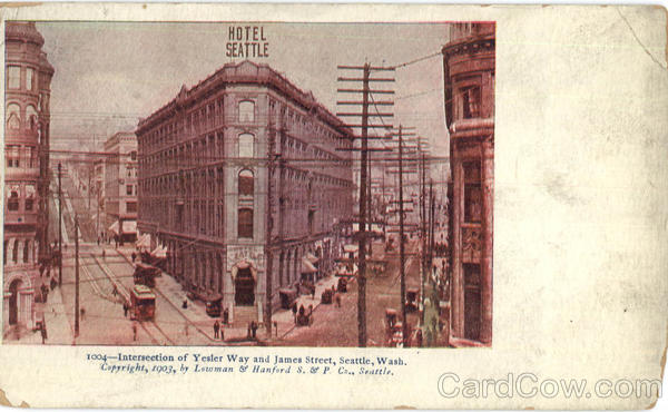 Front: SEATTLE 1004 Intersection of Yesler Way and James Street, Seattle, Wash. Copyright, 1903, by Lowman & Hanford S. & P. Ca., Seattle. Back: POST-CARD. Two CENTS