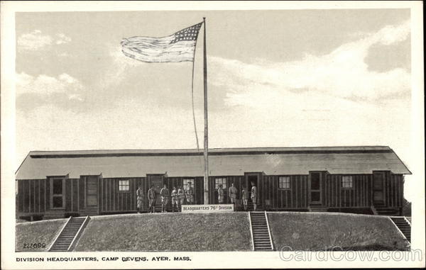 Front: 222699 HEADQUARTERS 76ยช DIVISION DIVISION HEADQUARTERS, CAMP DEVENS, AYER, MASS. Back: Sackett & Wilhelms Corp., New York and Brooklyn. Printed in U. S. A. THROUGHOUT SUPERIOR QUALITY THE WORLD FAMOUS CARD