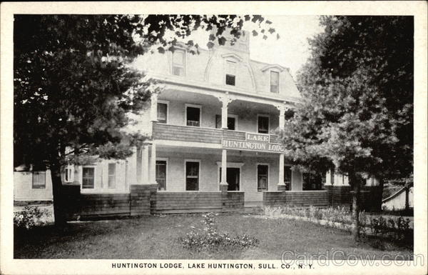 Front: LAKE HUNTINGTON LODG HUNTINGTON LODGE, LAKE HUNTINGTON, SULL. CO., N. Y. Back: 58042 PUBLISHED BY SAMPSON & LOVIN, LAKE HUNTINGTON, N. Y. BLACK AND WHITE 2mạnh 980 Ema 40 PLACE