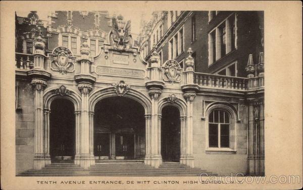 Front: 1905 DELWIT CLIDTODITIGH SCHOOL TENTH AVENUE ENTRANCE, DE WITT CLINTON HIGH SCHOOL, N. Y. Back: PHOTO-GELATINE PRINTING CO., N. Y. POST CARD, HERE