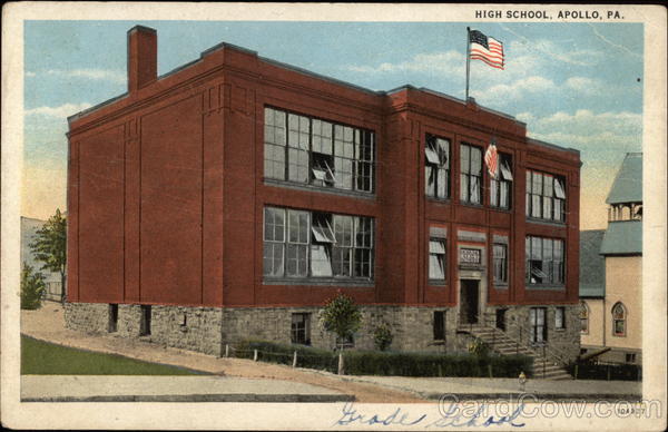 Front: HIGH SCHOOL, APOLLO, PA. 2123 WAN Grade School 104327 Back: PUBLISHED BY I. ROBBINS & SON, PITTSBURGH, PA. 86 FAIOR'S TRAS Sie 933 RICAN Arms $154 "Iye" HERE