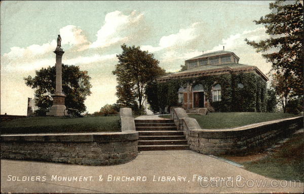 Front: 11 SOLDIERS MONUMENT & BIRCHARD LIBRARY, FREMONT, O Back: (Printed in Britain). J. Joseph & Son, Fremont, Ohio. 61757. THIS SPACE MAY BE USED FOR CORRESPONDENCE. Marian Aug, 20, 1908