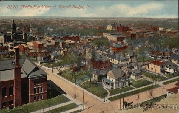 Front: 8170. Bird's-Eye View of Council Bluffs, la. WW ** HV ****** *** 13 Back: хоч 99 efte STAMPHERE TWO CENTS
