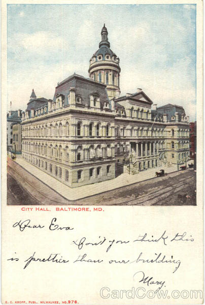 Front: Lazil CITY HALL, BALTIMORE, MD. Dear Eva хвойдут is prettier than our think this building Mary. E. C. KROPP, PUBL. MILWAUKEE, NO.976. Back: 3- THIS SIDE IS EXCLUSIVEY FOR THE ADDRESS.