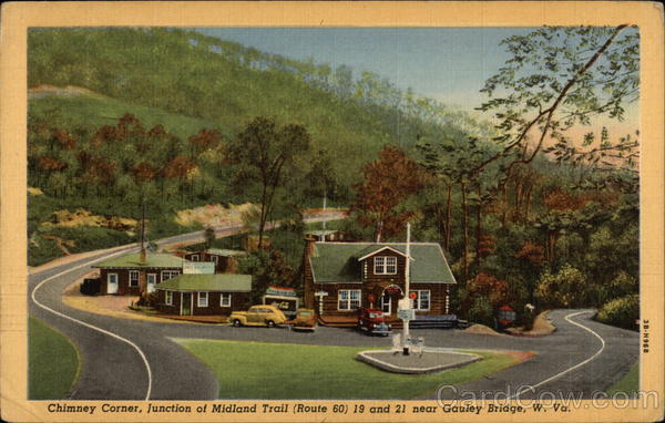 Front: s Cola Chimney Corner, Junction of Midland Trail (Route 60) 19 and 21 near Gauley Bridge, W. Va. 3B-H968 Back: THE S. SPENCER MOORE CO., CHARLESTON, W. VA. sin