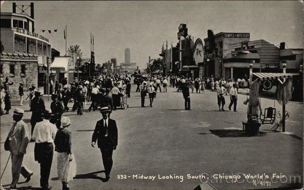 Front: TEMPLEMYSTERY 332 - Midway Looking South, Chicago World's Fair R-9171 Back: IN 1933 CENTURY OF PROGRESS CHICAGO WORLD'S FAIR 1933