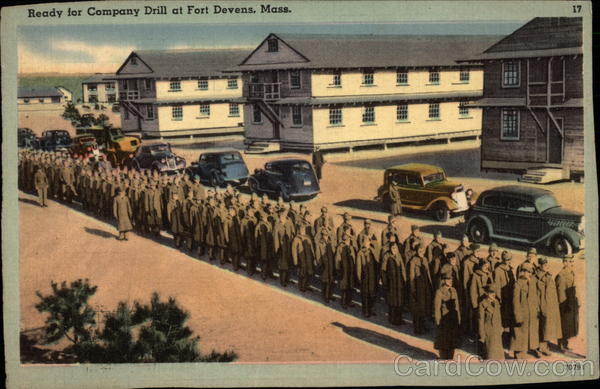 Front: 17 Ready for Company Drill at Fort Devens, Mass. FFF 70791 Back: MADE IN U, S. A *TICHNOR QUALITY VIEWS" REG. U.S. PAT, OFF. MADE ONLY BY TICHNOR BROS., INC., BOSTON, MASS. MFG. BY TICHNOR BROS., INC., 160 NO. WASH. ST. BOSTON, MASS.