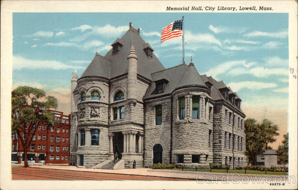 Front: Memorial Hall, 'City Library, Lowell, Mass. 49970-N Back: G. C. PRINCE & SON, INC.. LOWELL, MASS.