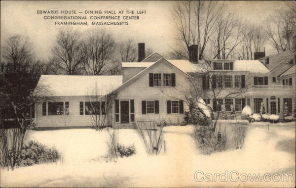 Front: EDWARDS HOUSE DINING HALL AT THE LEFT CONGREGATIONAL CONFERENCE CENTER FRAMINGHAM, MASSACHUSETTS Back: July 1956 Pub. by the Collotype Co., Elizabeth, N. J. and N. Y.