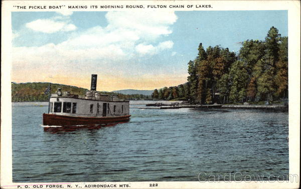 Front: "THE PICKLE BOAT" MAKING ITS MORNING ROUND, FULTON CHAIN OF LAKES, P. O. OLD FORGE. N. Y., ADIRONDACK MTS. 222 ON Back: PUB. BY STANDARD SUPPLY CO., OTTER LAKE, N. Y. MFO GEH FACINOR DUALITY VIEWS- MASS 121098 Ray B. Ekman 3 Jen 1987