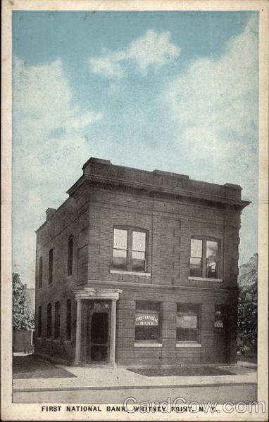 Front: FIRST NATIONAL BANK FIRST NATIONAL BANK, WHITNEY POINT, N. Y. Back: 56461-Pub. by Wm. Denning, Whitney Point, N. Y. SKY TINT st Po al TWO CENTS