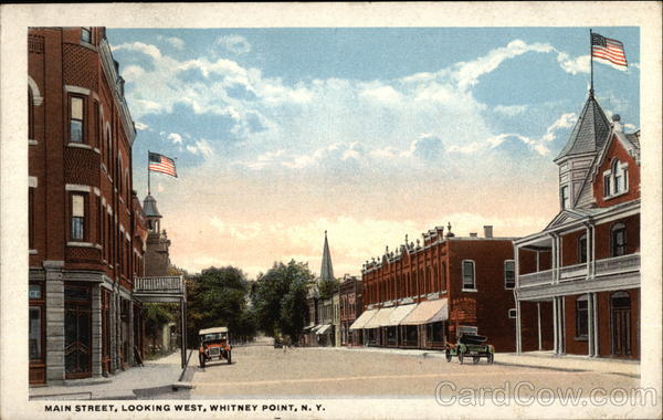 Front: CE MAIN STREET, LOOKING WEST, WHITNEY POINT, N. Y. ** ALLENS NES Back: MADE IN USA PUBLISHED BY WILLIAM DENNING, WHITNEY POINT, N. Y. 20 R-84923 MESSAGE MAY BE WRITTEN ON THIS SIDE T. AMERICAN Place the Stamp here