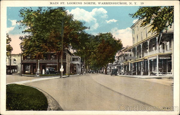 Front: MAIN ST. LOOKING NORTH, WARRENSBURGH, N. Y. 19 AR SA sis ********** DRUGS WAL 77 WOODWARD Livingstons 35 27152 Back: Pub. by C. W. Hughes & Co., Inc., Mechanicville, N. Y. QUALITY STAR QUALITY STAMP HERE