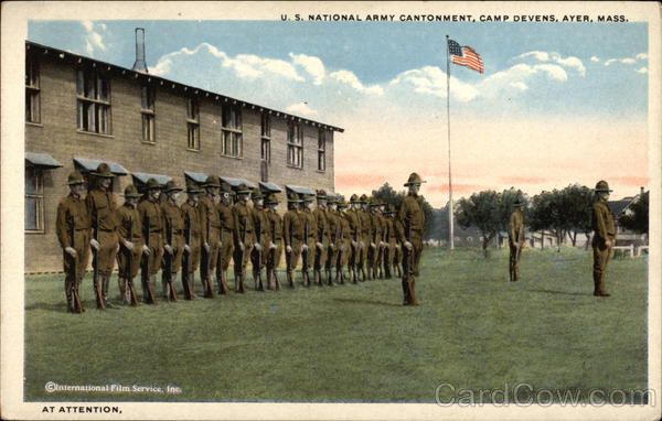 Front: International Film Service, Inc. AT ATTENTION, U.S. NATIONAL ARMY CANTONMENT, CAMP DEVENS, AYER, MASS. Back: 1751 CHICAGO A-76C65 209 DOST THIS SPACE FOR ADDRESS ONLY.