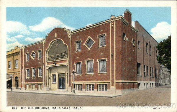 Front: 286 ITE B. P. O. E. BUILDING, IDAHO FALLS, IDAHO 1. M 11 TTI 746-29 Back: POST W BAKE ORE MESSAGE MAY BE WRITTEN ON THIS SIDE CHI PUBLISHED BY WESLEY ANDREWS, INC., BAKER, ORE. GOO HERE