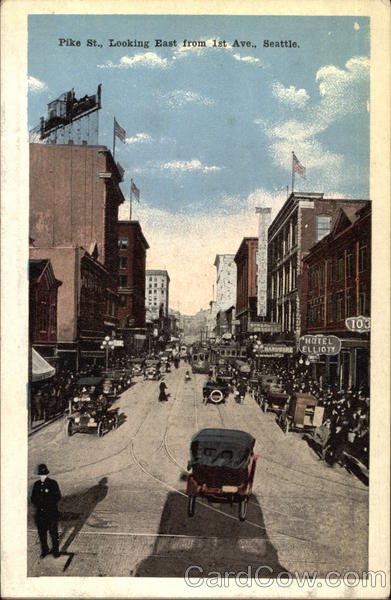 Front: Pike St., Looking East from 1st Ave., Seattle. IN ***** DRESSES HARDWARE ELLIOTT 103 Back: Pub. by The Puget Sound News Co., Seattle, Wash. PLAC 16112 CO