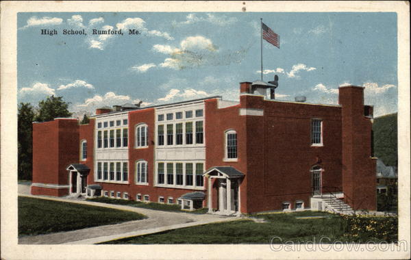 Front: High School, Rumford, Me. ceco cp com Back: Pub. by James F. Snow, Brunswick, Me. | JN4 TREE SNOW'S STATE POST CARDS DILICO MAINE QUALITY SERVICE 14040 CO