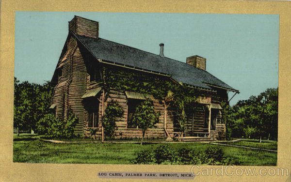 Front: LOG CABIN, PALMER PARK. DETROIT, MICH. Back: ULLMAN'S "GOLD BORDER" SERIES AMERICAN POST CARD-VIEW NUMBER 3155 PUBLISHED BY THE ULLMAN MANUFACTURING CO., NEW YORK. 2- DOMESTIC: FOREIGN: Two CENTS.