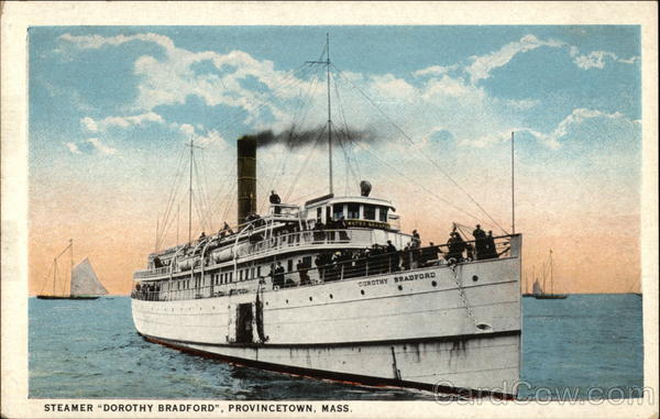 Front: ROTHY BRADFOR STEAMER "DOROTHY BRADFORD", PROVINCETOWN, MASS. DOROTHY BRADFORD Back: PUBLISHED BY H. A. DICKERMAN & SON, TAUNTON, MASS. MADE IN USA A-52352 MERICAN To HERE