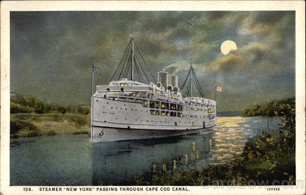 | The Cape Cod Canal extends from Sandwich to Buzzards bay and is 8 miles in length. It was 5 years in building, and cost $12,000,000. A saving of 60 miles or more is made on the course between New York and Boston. Tolls are charged according to the tonnage of the vessel |