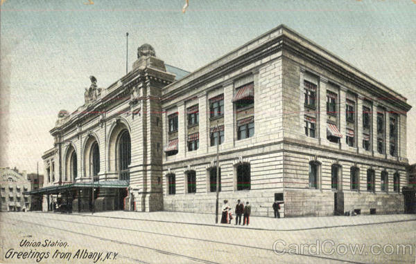 Front: Union Station Greetings from Albany, NY Back: H.C. Leighton Co., Portland, Me. Manufacturers of Postal Cards. Made in Germany N°341. One Cent for United States, and Island Possessions, Cuba, Canada and For Foreign.