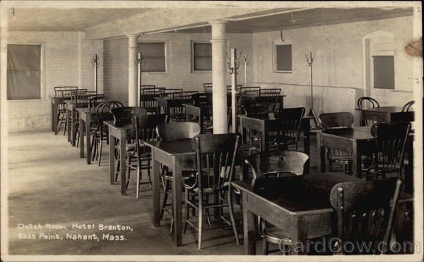 Front: Dutch Room, Hotel Brenton, Bass Point, Nahant, Mass. 1187 Back: e bunuon ha and Post Cards and Art Novelties. HERE