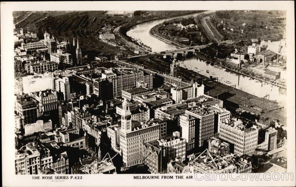 Front: triort FEE THE ROSE SERIES P.622 MELBOURNE FROM THE AIR Back: Published by the Rose Stereograph Co. Armadale, Victoria. Ther portion The "Rose" Series De Luxe is only a small of Melbou ock. A Real Photograph Produced in Australia