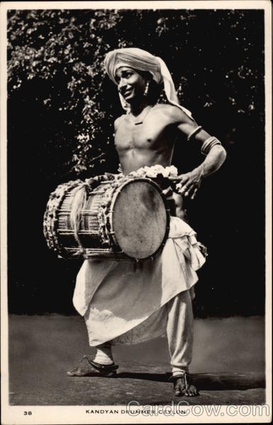 Front: 38 KANDYAN DRUMMER, CEYLON. Back: COPYRIGHT BY CEYLON PICTORIALS. THIS IS A REAL PHOTOGRAPH ADDRESS TO BE WRITTEN HERE