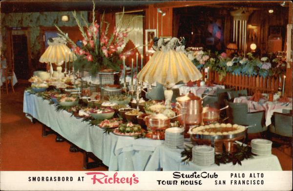 Front: SMORGASBORD AT Rickey's Studio Club PALO ALTO TOWN HOUSE SAN FRANCISCO Back: Rickey's ON EL CAMINO Studio Club AT PALO ALTO Rickey's VAN NESS AT CLAY TOWN HOUSE IN SAN FRANCISCO Mailing Souvenir De 2- HERE
