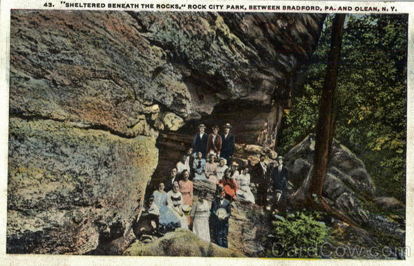 Front: 43. "SHELTERED BENEATH THE ROCKS," ROCK CITY PARK, BETWEEN BRADFORD, PA. AND OLEAN, N. Y. Back: PUBLISHED BY HARRY H. HAMM, TOLEDO, OHIO. HH Hamm Toledo, Ohio A-53739 AND CANADA. TWO CENTS.