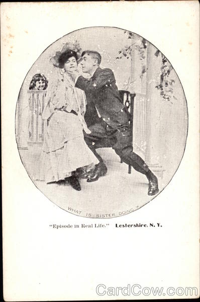 Front: WHAT ST IS SISTER DOING 2 "Episode in Real Life." Lestershire, N. Y. Back: Post Card D Ad rss Crusers-Gardner Cal. Co. Montrose, Pa
