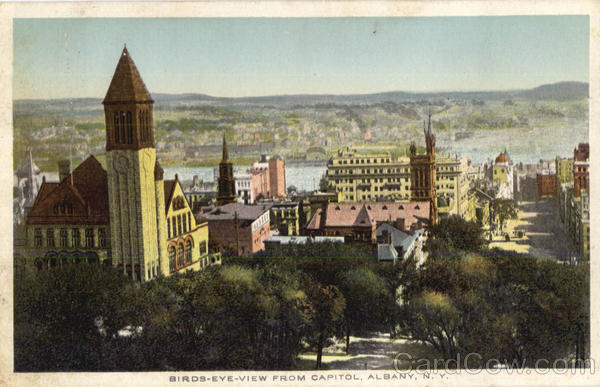 Front: BIRDS-EYE-VIEW FROM CAPITOL, ALBANY, N. Y. Back: PUBLISHED BY THE UNION NEWS COMPANY NEW YORK 2148 HIROM NEW YORK G&S Registered