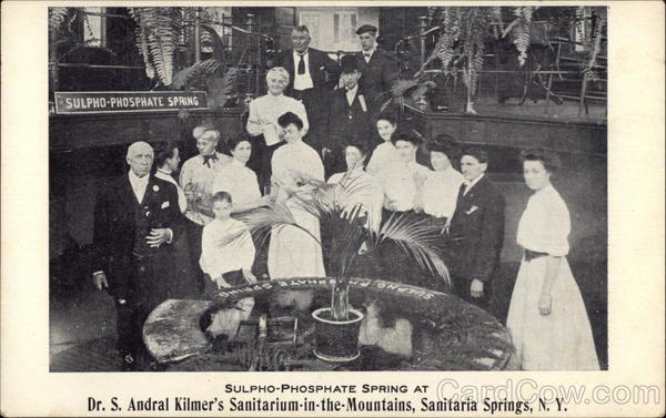 Front: SULPHO-PHOSPHATE SPRING OnIddS BAVHE CHANS SULPHO-PHOSPHATE SPRING AT Dr. S. Andral Kilmer's Sanitarium-in-the-Mountains, Sanitaria Springs, N. Y. Back: 8- PLACE THE HERE