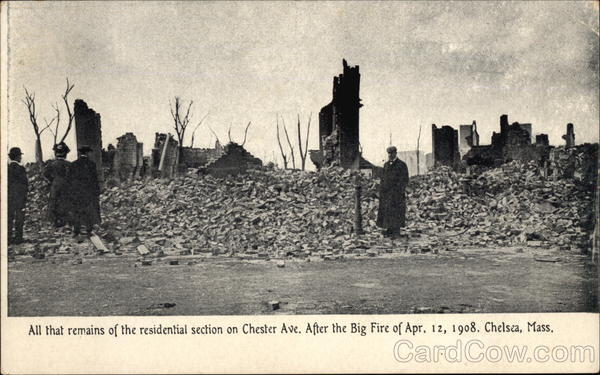 Front: All that remains of the residential section on Chester Ave. After the Big Fire of Apr. 12, 1908. Chelsza, Mass, Back: THIS SPACE MAY BE USED FOR CORRESPONDENCE, N. C, PAPER & STATIONERY CO. MFRS. AYER, MASS.