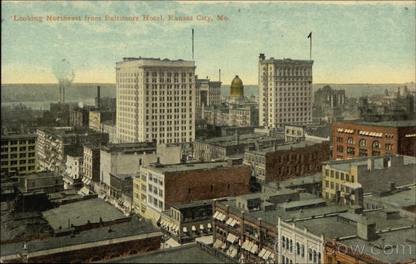 Front: Looking Northeast from Baltimore Hotel, Kansas City, Mo. Back: 3.00 RIS யோ Pust Cauwe ME LEIPZIG BERLIN NEW YORK M-933---Pub. by The South West News Company,