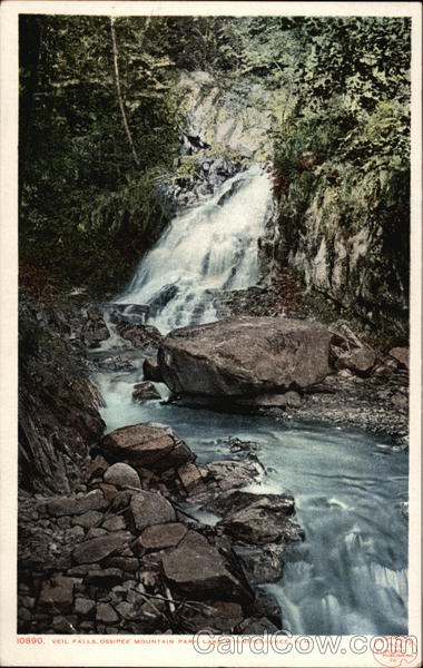 Front: COPYRIGHT 1906, 10890. VEIL FALLS. OSSIPEE MOUNTAIN PARK, LAKE WINNIPESAUKEE. N. H. BY DETROIT PUBLISHING CO. Back: 4.00 AND CANADA. FOREIGN. TWO) MADE ONLY BY DETROIT PUBLISHING CO. "PHOSTINT"CARD THIS SPACE MAY BE USED FOR MESSAGE.