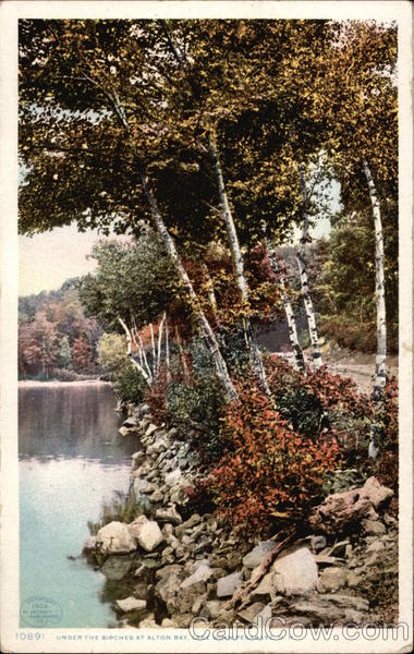Front: OPTRIGHT 1906. BY DETROIT PUBLISHING CO 10891 UNDER THE BIRCHES AT ALTON BAY, LAKE WINNIPESAUKEE, N. H. Back: 4.00 AND CANADA. FOREIGN. TWO MADE ONLY BY DETROIT PUBLISHING CO. "PHOSTINT" CARD. THIS SPACE MAY BE USED FOR MESSAGE.