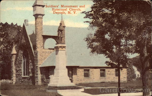 Front: Soldiers' Monument and Episcopal Church, Depoșit, N. Y. Back: SHERM 1114 20 POSTCARD , Domestic and PA. 13617_PUB, BY LESLIE E. CARL, JEWELER, DEPOSIT, N. Y. Hius J. b- Iray 6458 nawe Hest Haven سر lami 75