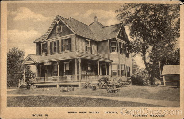 Front: VER MEW HRSE RIVER VIEW HOUSE DEPOSIT, N. Y. ROUTE 51 TOURISTS WELCOME Back: PUBLISHED BY LESLIE E. CARL, INC., DEPOSIT, N. Y. Bloomne Post Cards of Quality. The Albertype CC. Ercct yn, N. Y. 3-