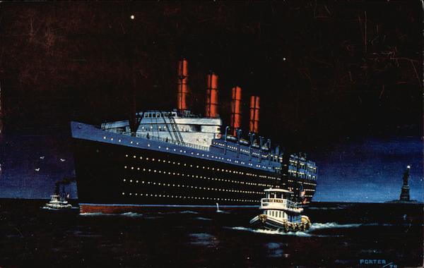 Just 3 years old, the mighty Cunard Liner "Lusitania" slackens her speed into New York Harbor, ready to be towed to her pier by awaiting tugs. First British liner equipped with turbine engines and an Atlantic Blue Ribbon Speed Champion, torpedoed off Old Head of Kinsale, Ireland, May 7, 1915, 1198 dead |