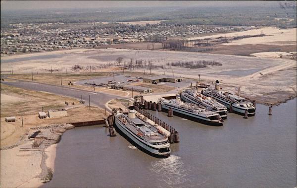 | Aerial view of fleet berthed at Cape May Ferry Terminal. Administration and maintenance buildings in background. Waiting room and snack bar open 24 hours daily. Delightful Delaware Bay Crossing takes 70 minutes on regularly scheduled trips |