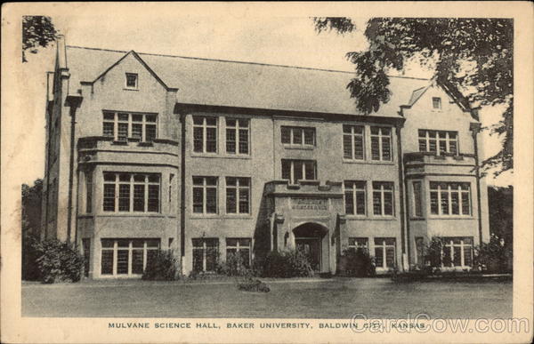 Front: MULVANE SCIENCE HALL, BAKER UNIVERSITY, BALDWIN CITY, KANSAS Back: PUBLISHED BY HITCHCOCK DRUG CO., BALDWIN CITY, KANSAS THE FINEST AMERICAN MADE VIEW POST CARDS-THE ALBERTYPE CO., BROOKLYN, N, Y. 100 N74