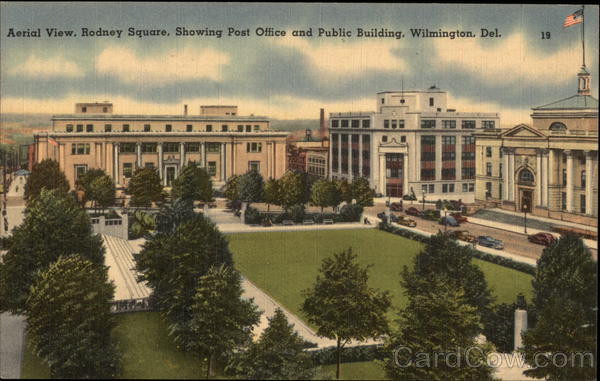 Front: Aerial View. Rodney Square, Showing Post Office and Public Building, Wilmington, Del. 19 狮..風.. Back: MADE IN U. A. res Sept 2-1952 PUB, BY DEL MAR NEWS AGENCY, WILMINGTON, DEL, 71323