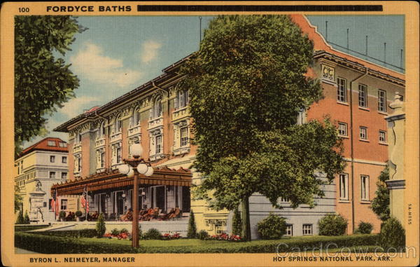 Front: 100 FORDYCE BATHS BYRON L. NEIMEYER, MANAGER HOT SPRINGS NATIONAL PARK, ARK. 5A-HS55 Back: WOODCOCK MFG. CO., HOT SPRINGS NATIONAL PARK, ARK. "We Bathe The World"