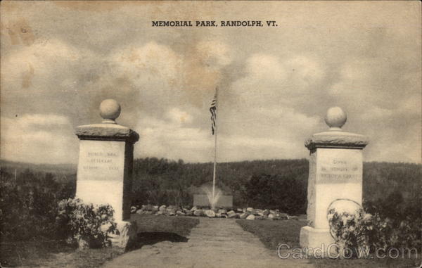 Front: MEMORIAL PARK, RANDOLPH, VT. ORLO WAK CIVEN VEERANS MEORIAL ARE VICTOR A (RAST Back: 1977 GMS S. Published by Grant's Drug Store, Randolph, Vt.