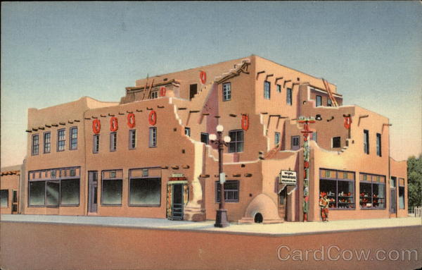 | This building is in the typical Indian Pueblo style, with each floor terraced back from the one below. The strings of drying "chili peppers" decorate the houses with their brilliant color in the fall of the year. Note the top of a bake-oven on the roof, while in the foreground is a Navajo sweat house - replica of those used in the cure of the sick |