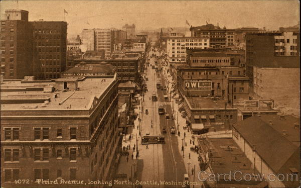 Front: OY WEITE MNTEL LGRAND OP RA HOUSI marica's PAXTON HOTEL LHOP OWLIGAR POOL CUICK 00LAN 1072- Third Avenue, looking North.Seattle,Washington. Back: $ 1¢ 2¢ PUBLISHED BY Edw. H. MITCHELL, SAN FRANCISCO