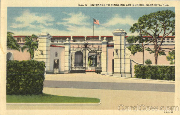 Front: S.A. 5 ENTRANCE TO RINGLING ART MUSEUM, SARASOTA, FLA. 6 A-H627 Back: z- “C.1. ART-COLORTONE" REG.U.S. PAT. OFF. MADE ONLY BY CURT TEICH & Co., INC., CHICAGO WILLIAMS WHOLESALE PAPER CO., SARASOTA, FLA.